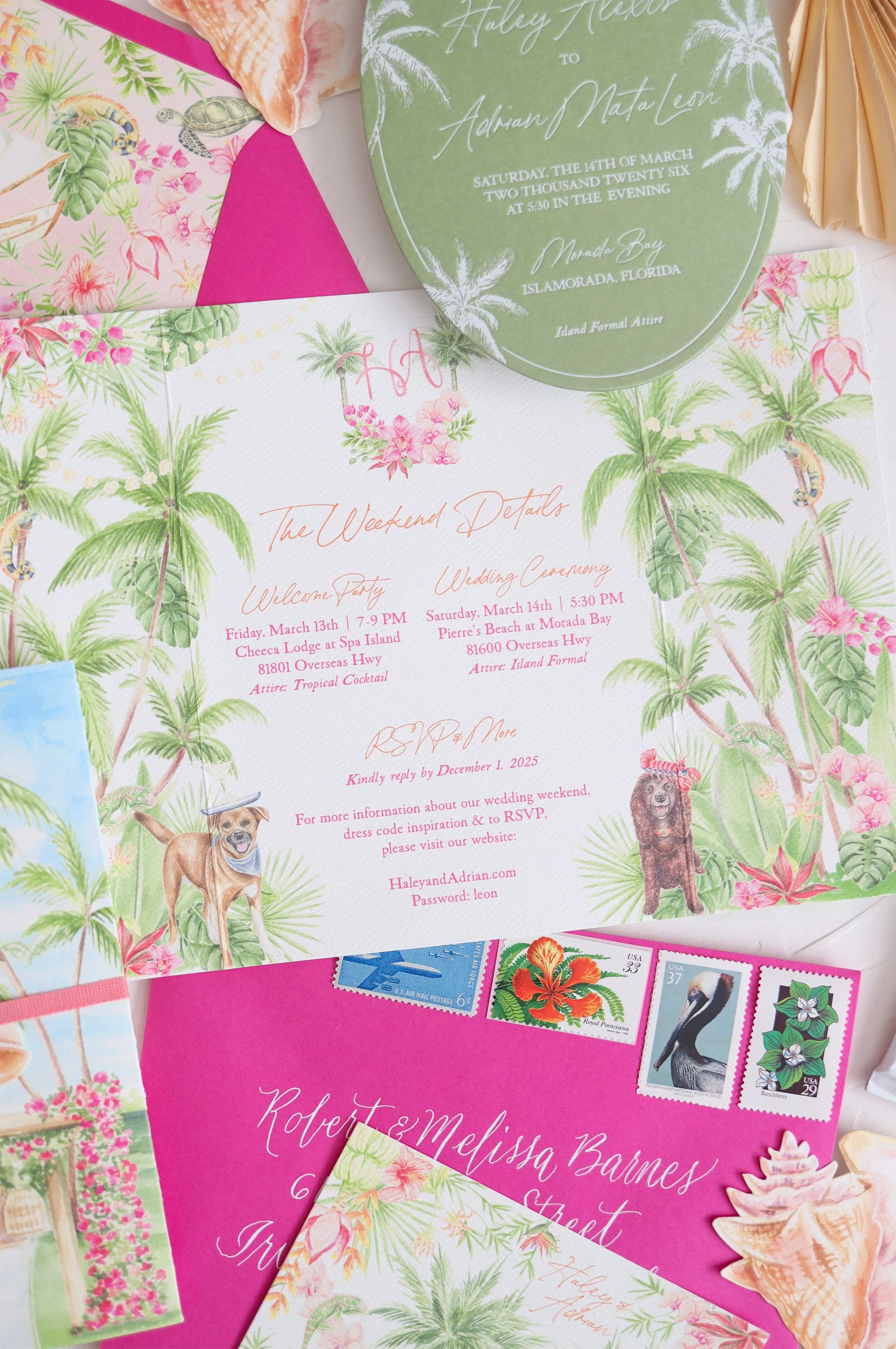 Haley + Adrian love the beach, their pups, good vibes and color. We had so much fun painting all the playful details like a crocodile in a lounge chair by the water, iguanas amongst the lush, tropical foliage and of course, both of their dogs as little butlers holding trays of drink and food! This is a perfect example of inserting your personality into your stationery to set the tone for your big day!
