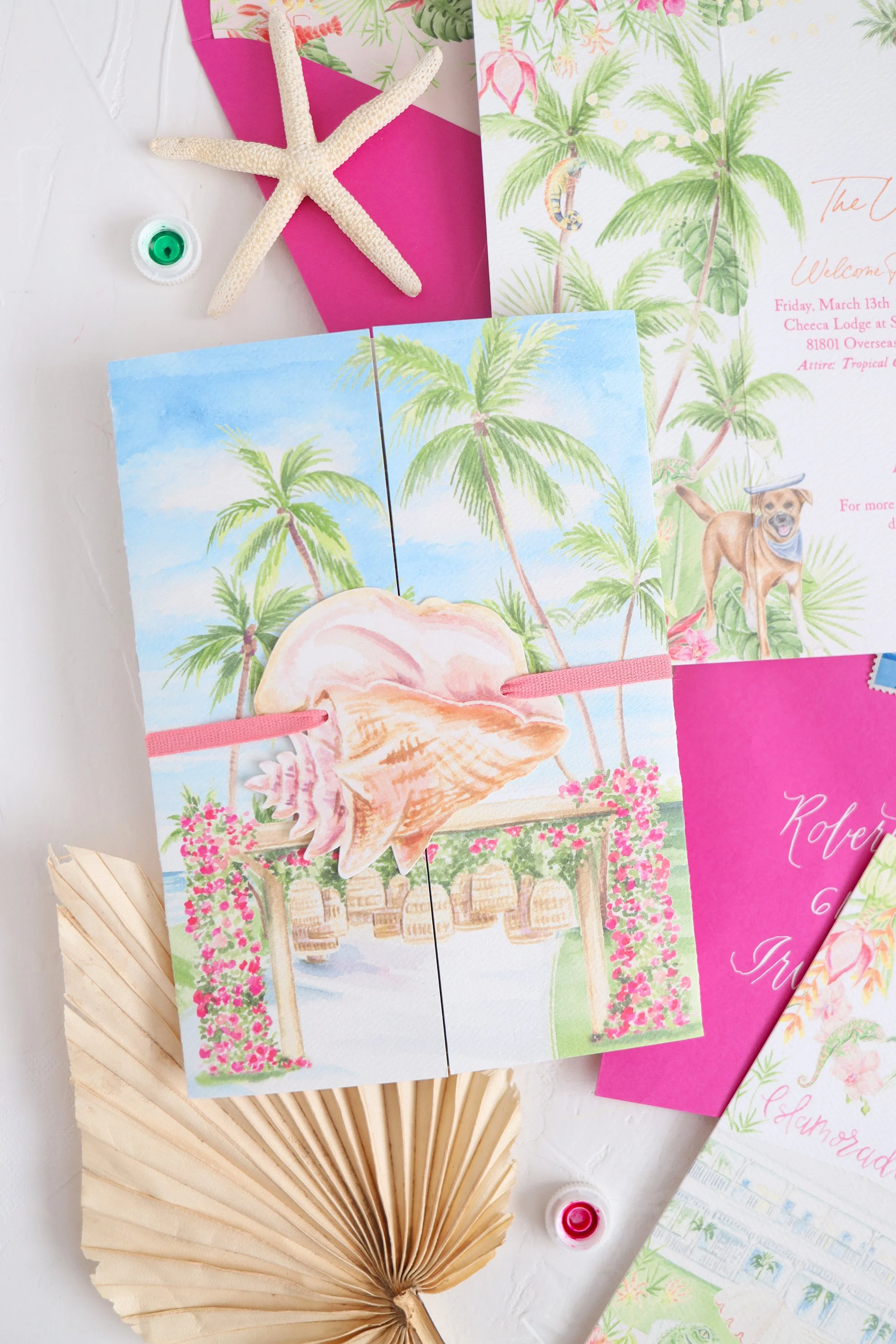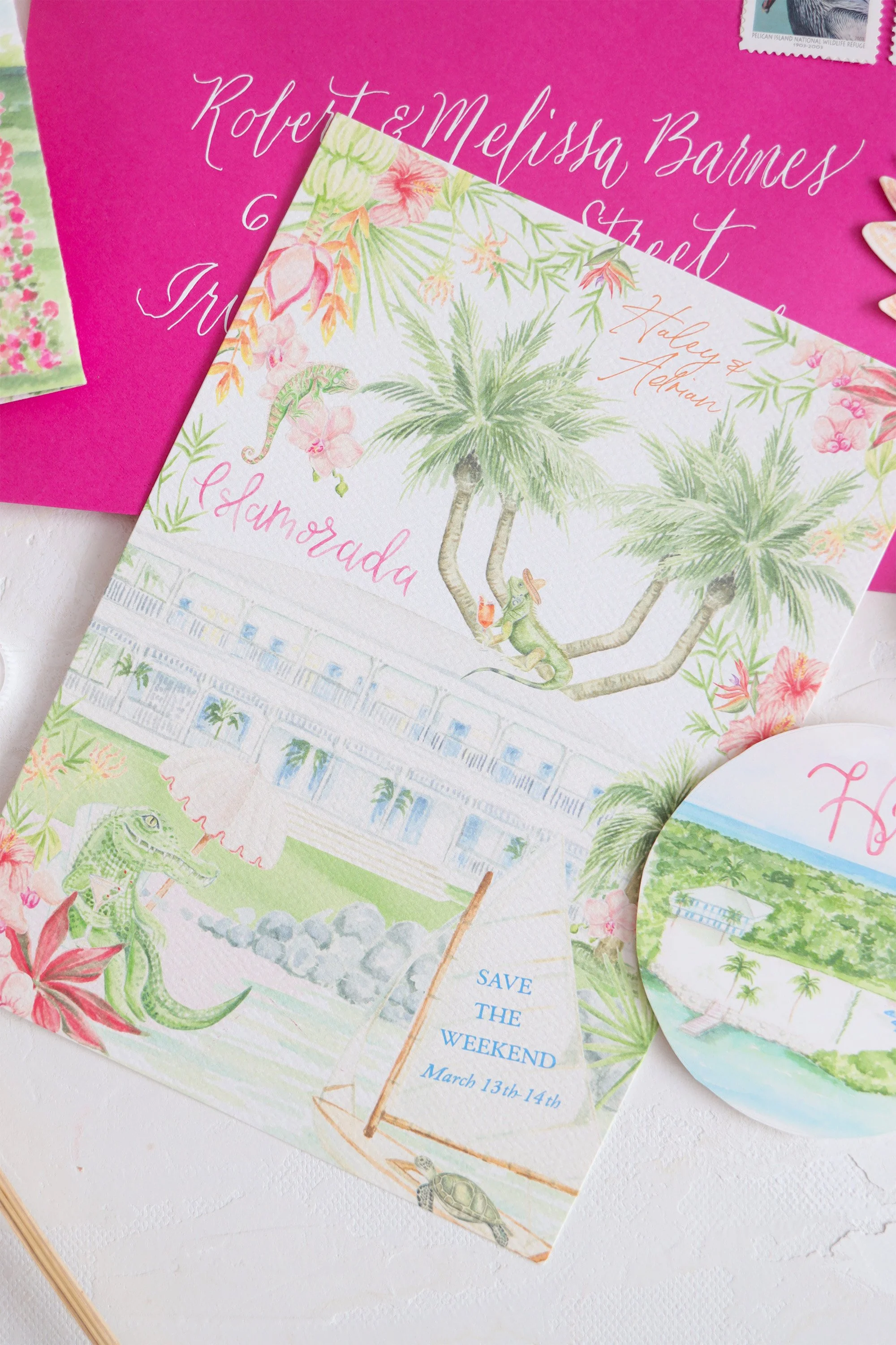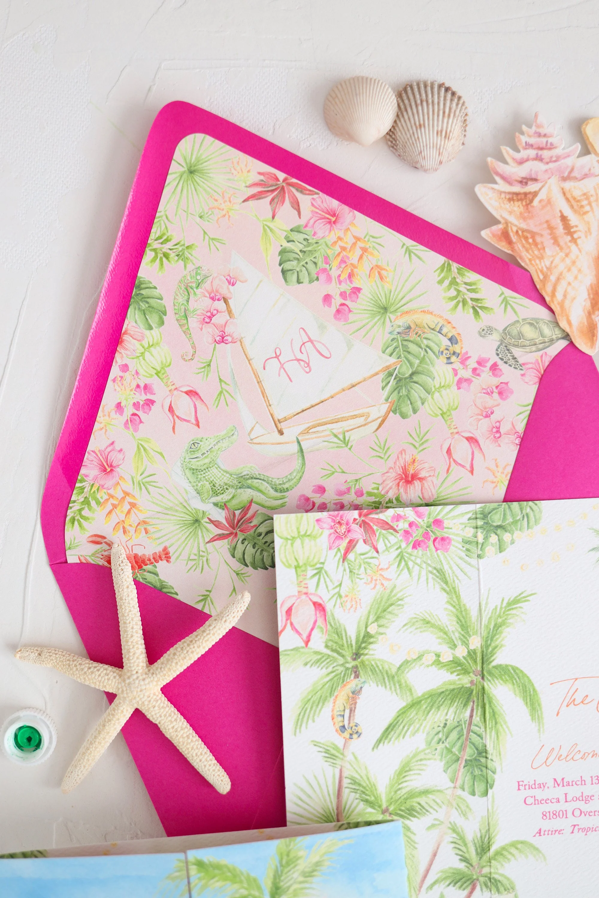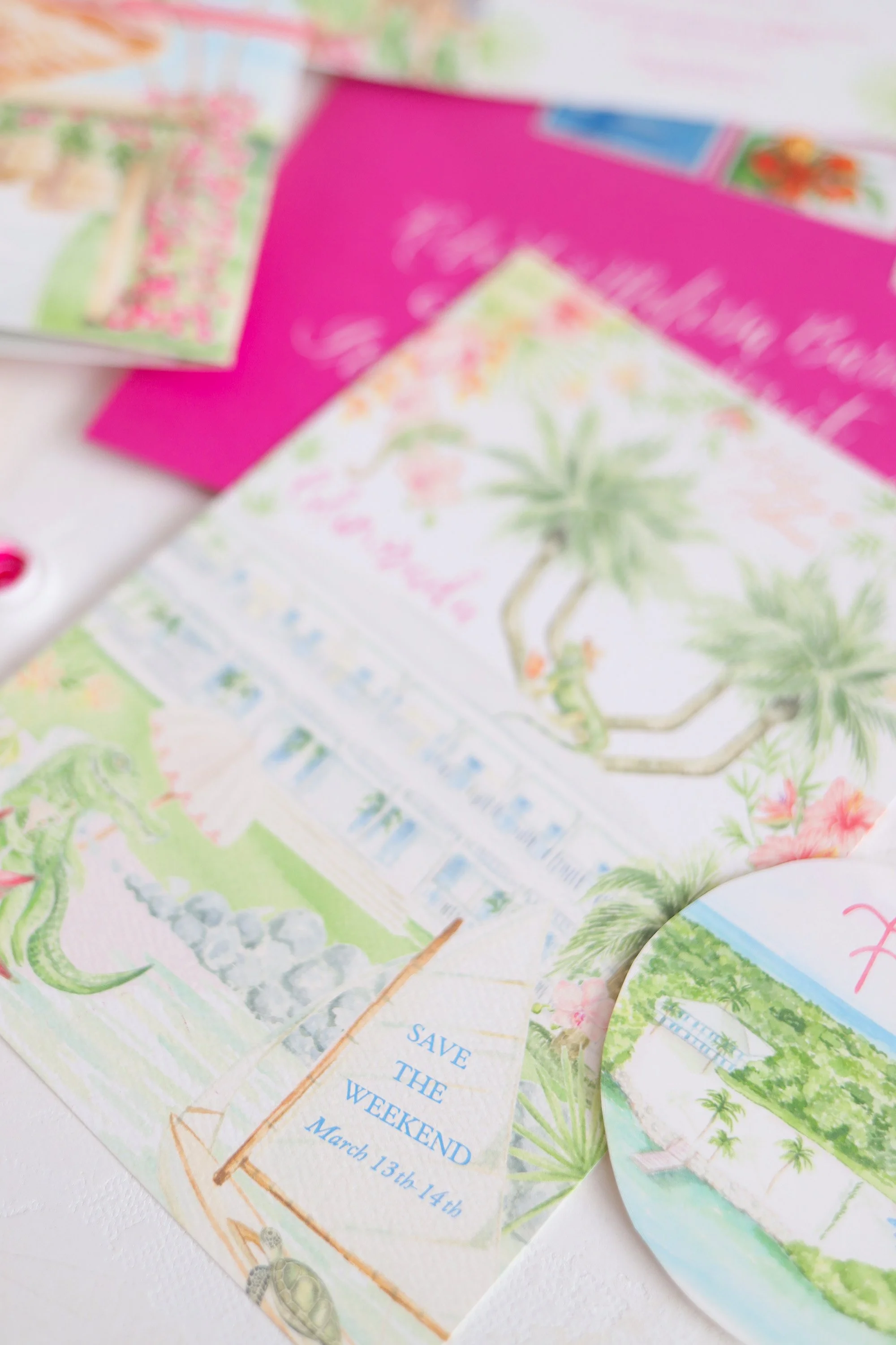 One of our favorite ways to immediately convert upscale, luxury and sophistication amongst all of the fun, whimsical watercolor artwork seen throughout the invitation suite is to have the invitation be printed with either white foil ink or letterpress. Both leave an impression in the extra thick stock, letting the traditional printing method and the paper weight speak for itself to your guests. Think, yes, we are going to have fun and maybe see some iguanas but this is also a high end affair.