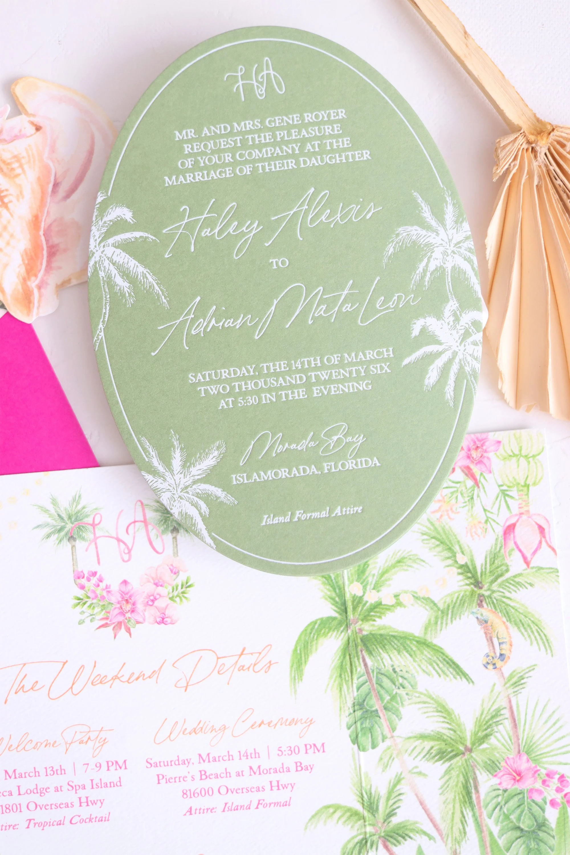 Full Invitation Suite: Watercolor Save The Date, White Foil Printed Oval Die Cut Invitation, Gatefold Details Card With Print on Front & Watercolor Artwork Inside, Custom Watercolor Crest & Monogram, Hand-Painted Watercolor Envelope Liner, Die Cut Conch Shell