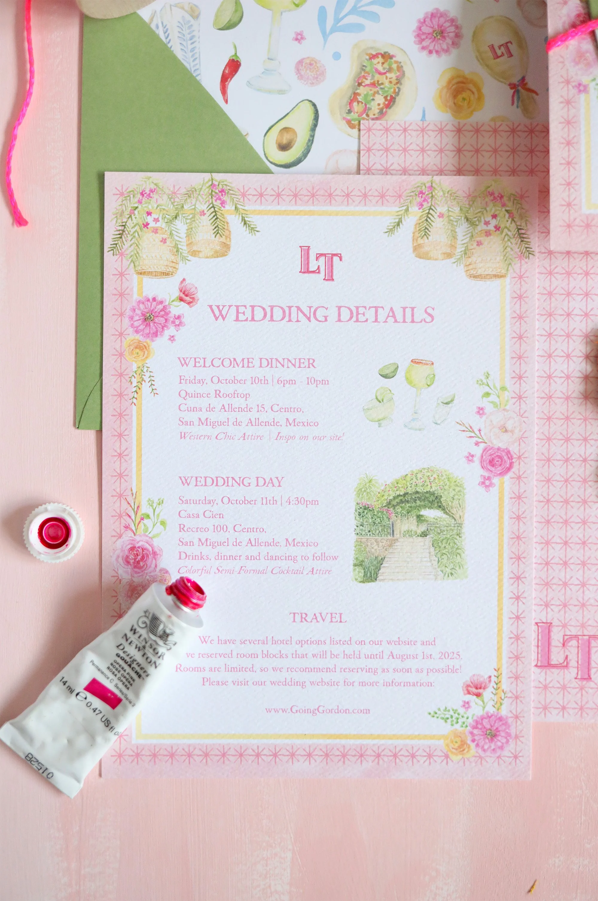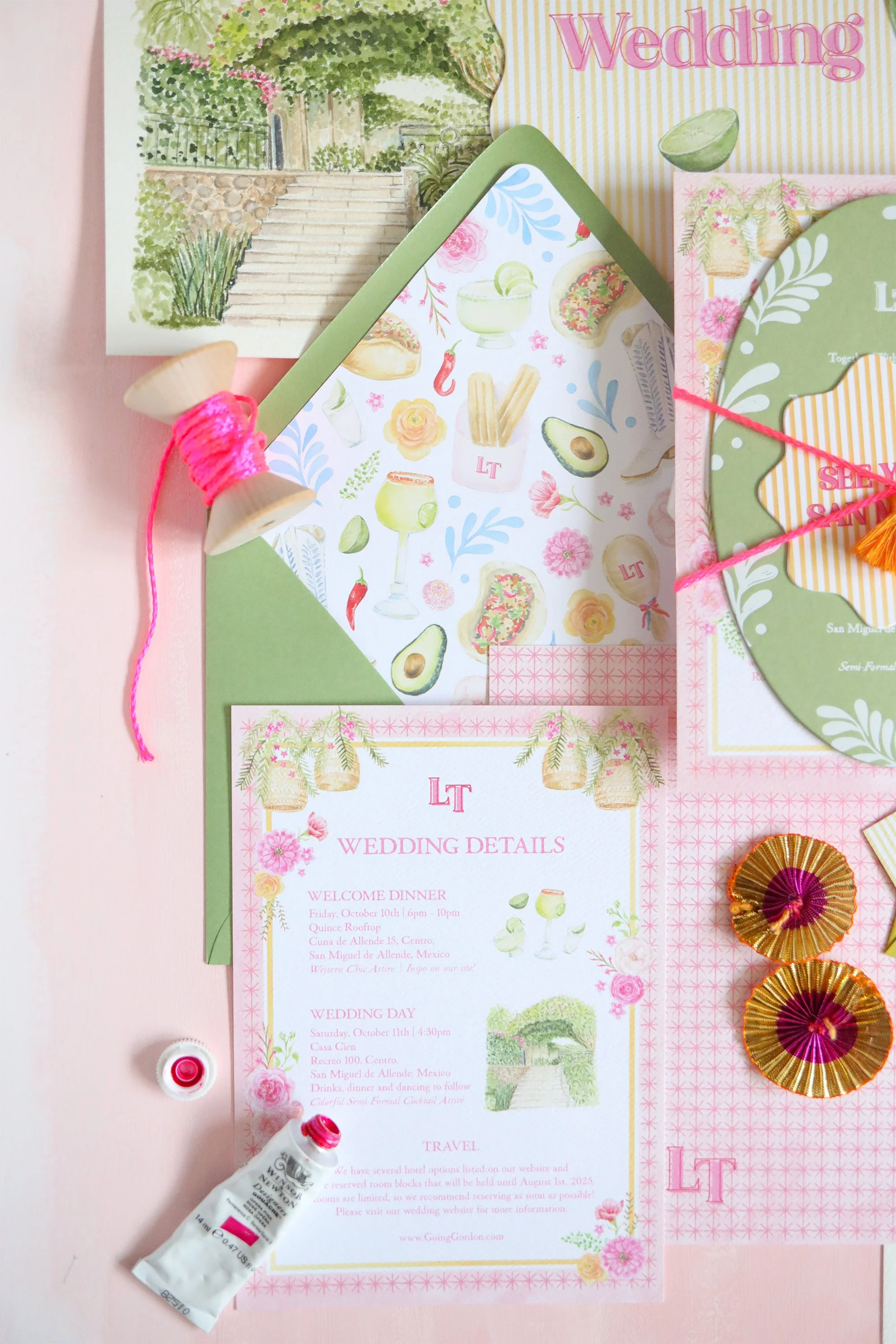 A San Miguel wedding always has that festive, funky, colorful, playful feel to it no matter what. It’s all about food, culture, prints, dancing, parades and margaritas. I wanted the envelope liner to capture this essence so right away, guests are feeling that energy through the stationery. It’s like someone tossed all those elements into the air like confetti and said “Let’s go party!”
