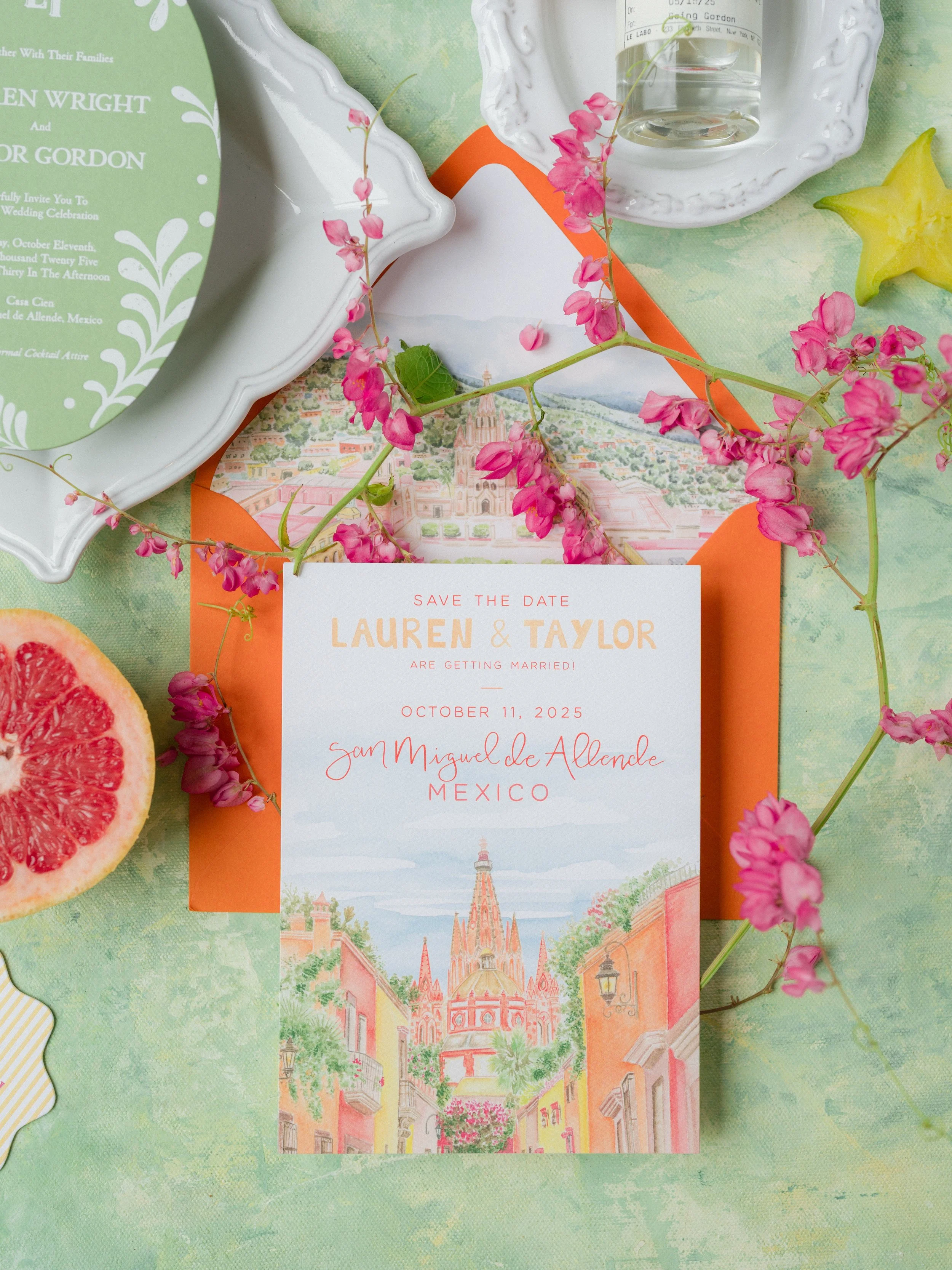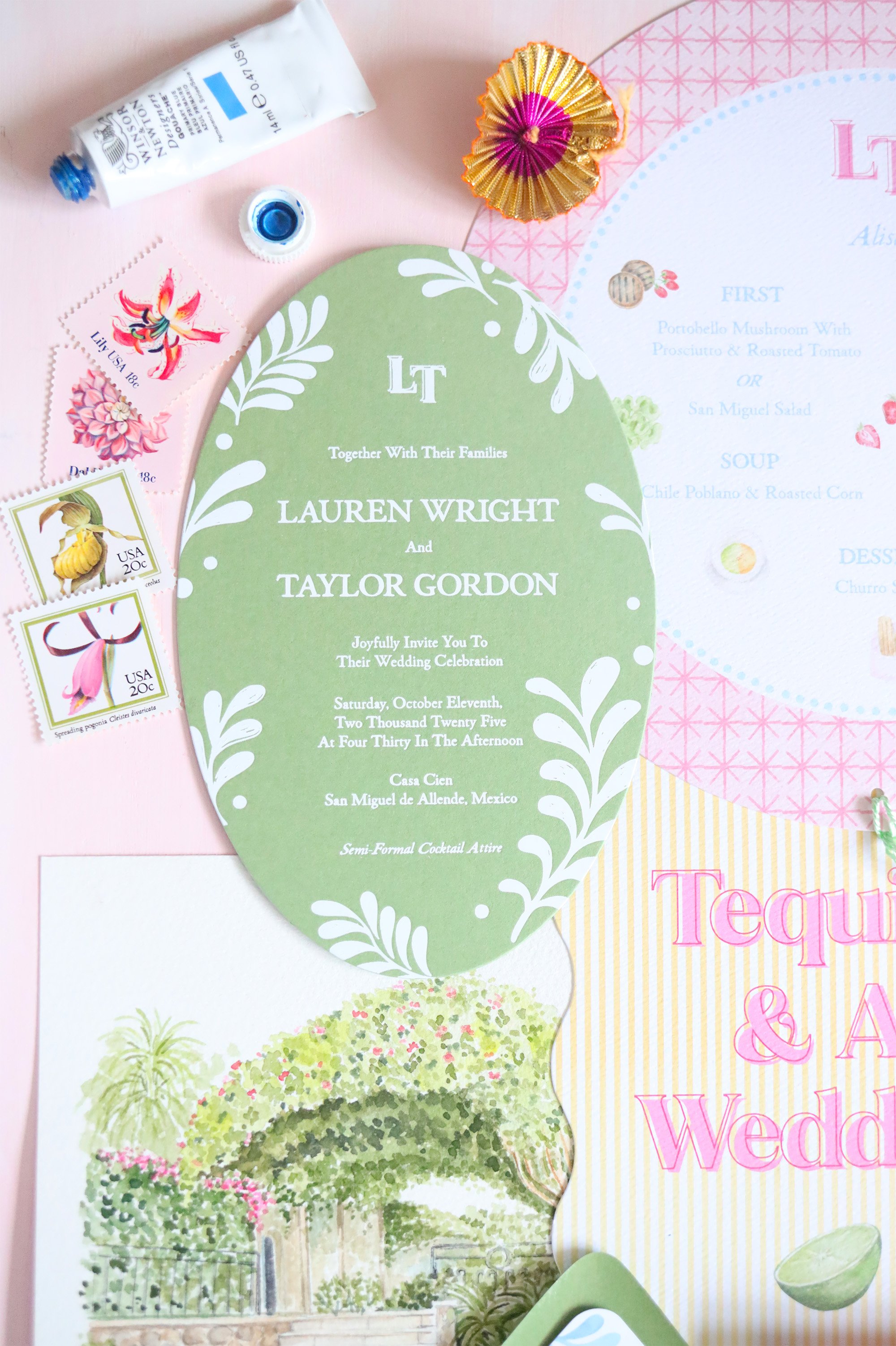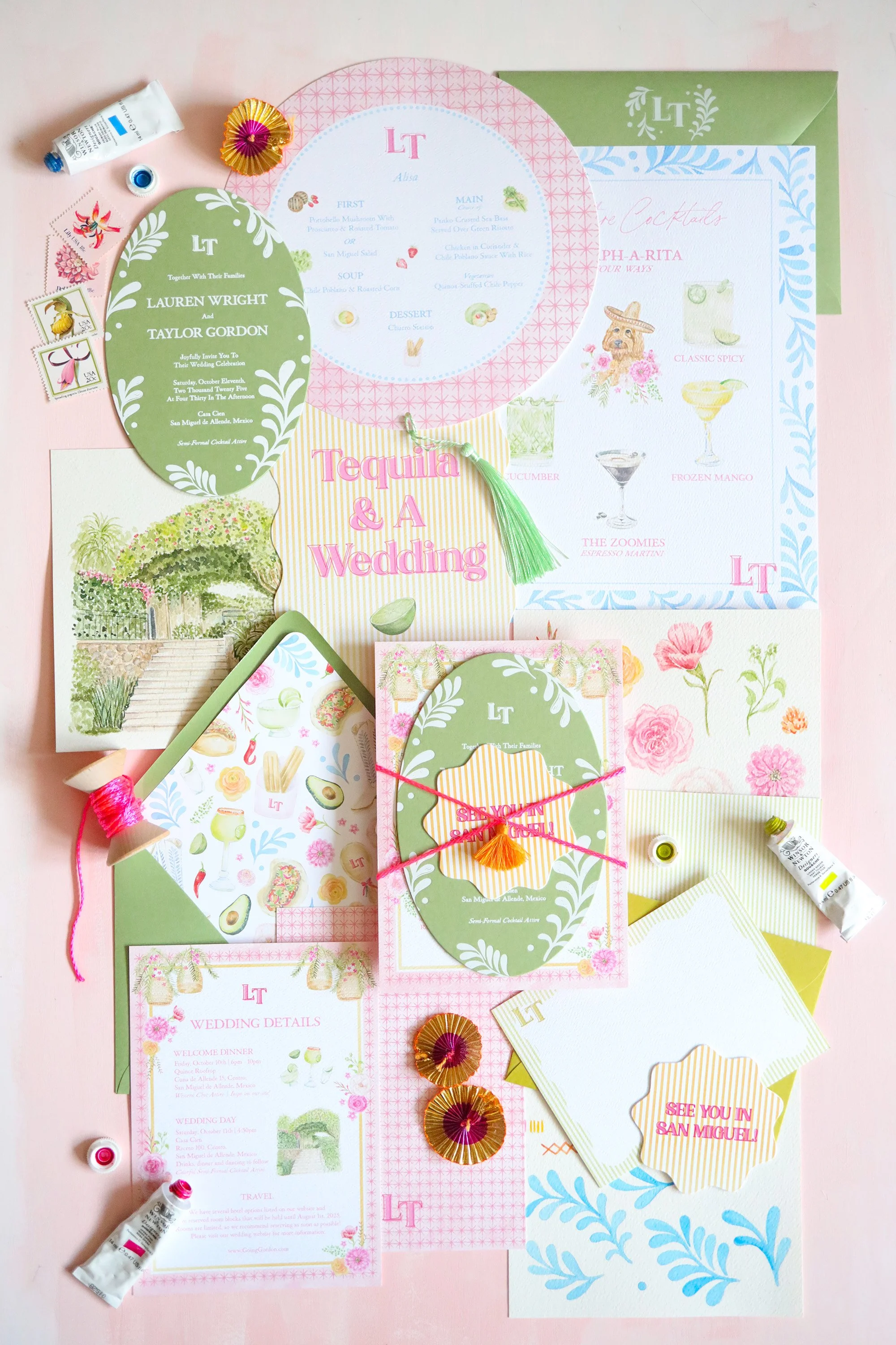 Lauren + Taylor know how to have fun and they love tequila. So what better place to have their wedding than San Miguel? They had this catch phrase from the start ‘tequila and a wedding’ so it was only fitting to work that into our personalized touches throughout the stationery! We played with all the fun colors, prints and patterns that pertained to their unique vision, paired all that with a playful monogram and unique watercolor illustrations to create this joy filled stationery suite for their big day.